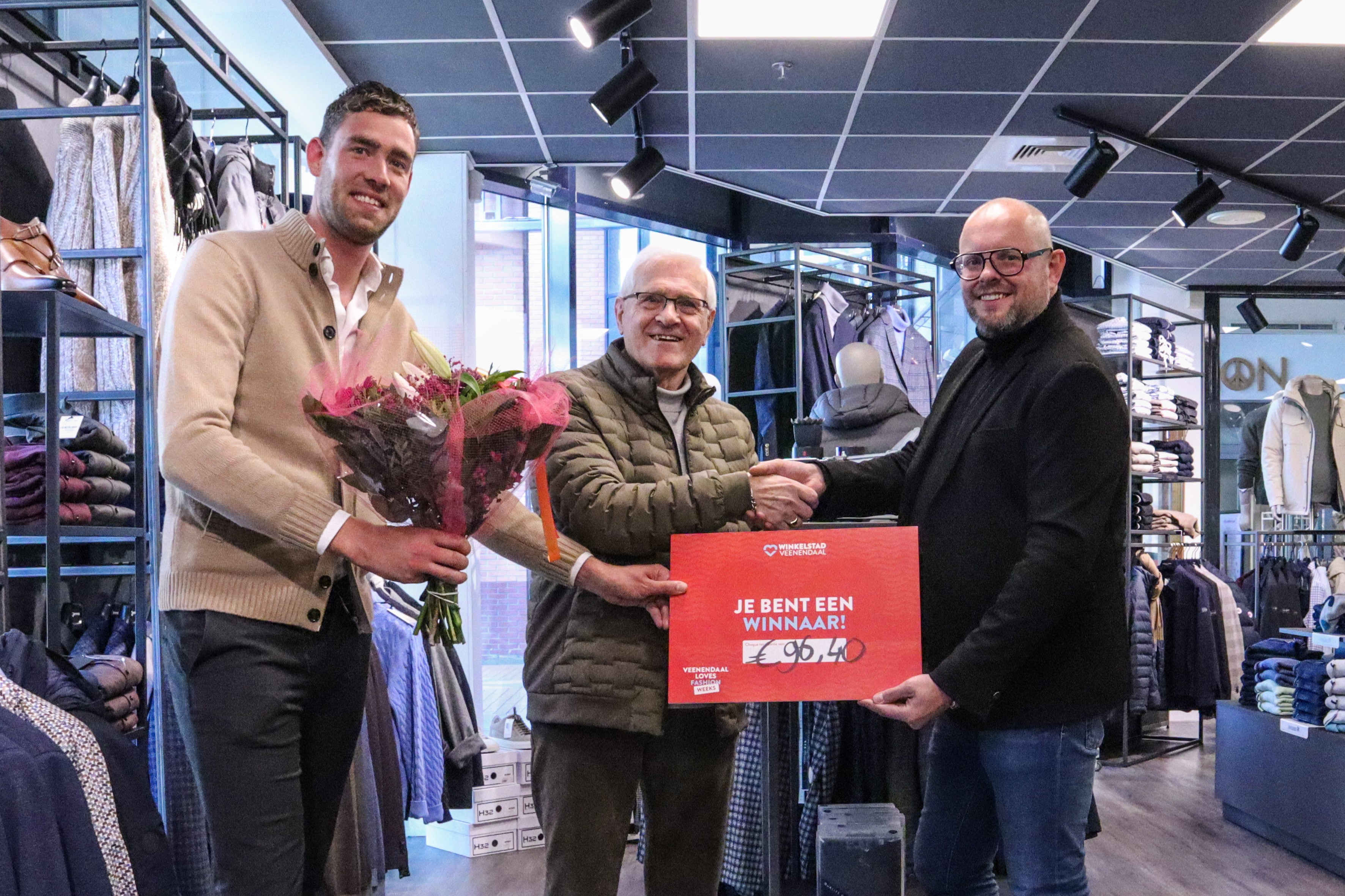 Binnenstadsmanger Henny Jansen mocht de eerste cheque à €96,40 overhandigen aan Jan Meijerink uit Veenendaal. Jan had vorige week bij Qemmo gewinkeld en zijn oog laten vallen op een mooie broek. Jan: ‘’Ik kom al jaren bij Qemmo en wordt altijd erg fijn geholpen. Ik kreeg een flyer mee met instructies voor de actie en heb thuis direct mijn kassabon geüpload op de website’’ De Veenendaal Loves Fashion Weeks lopen nog tot en met woensdag 19 oktober a.s. De tweede winnaar van het aankoopbedrag wordt volgende week bekend gemaakt.