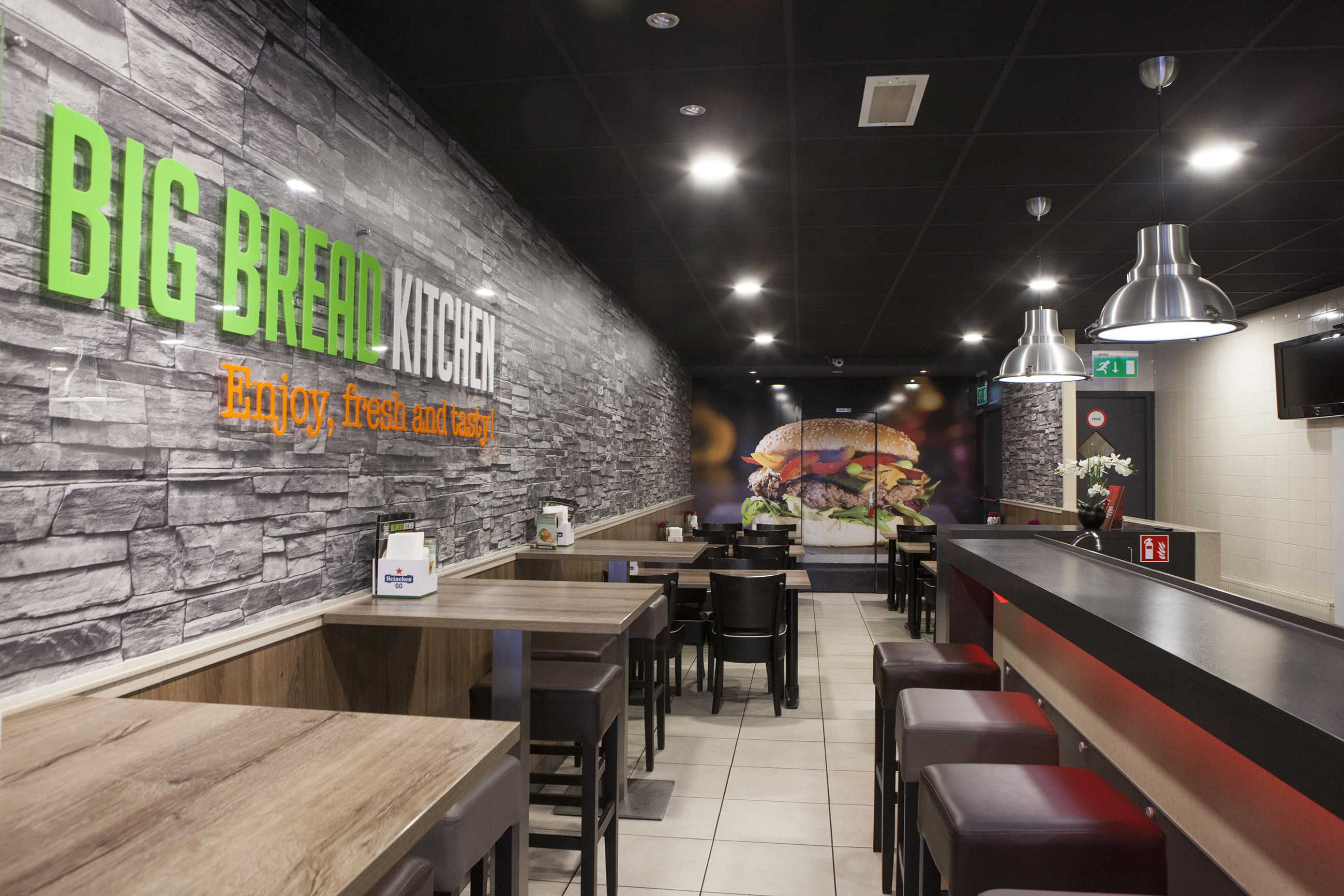 Big Bread Kitchen is het nieuwe gezicht van Big Bread cafetaria. Na jaren van sterke groei is de tijd aangebroken voor een nieuwe look en stijl. En uiteraard niet alleen voor het oog. Onze nieuwe uitstraling gaat samen met veel nieuwe en verse (huisgemaakte) producten. Proef een van onze 18 heerlijke en beroemde burgers. Daarnaast serveren wij ook zeer smaakvolle maaltijden en maaltijdsalades bereidt met alleen de beste en meest verse ingrediënten. Big Bread Kitchen staat voor kwaliteit en uitstekende smaak.